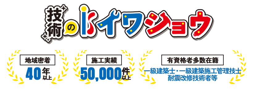 総合建設業者イワショウでは、部分的なリフォームをはじめ、全面改修工事(フルリフォーム・リノベーション)、耐震補強工事、エクステリア外構、新築注文住宅、店舗商業施設の内装工事など、建物に関する工事全般を請け負っております(木造住宅・マンション専有部分)。