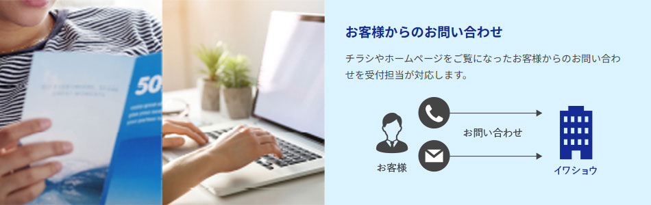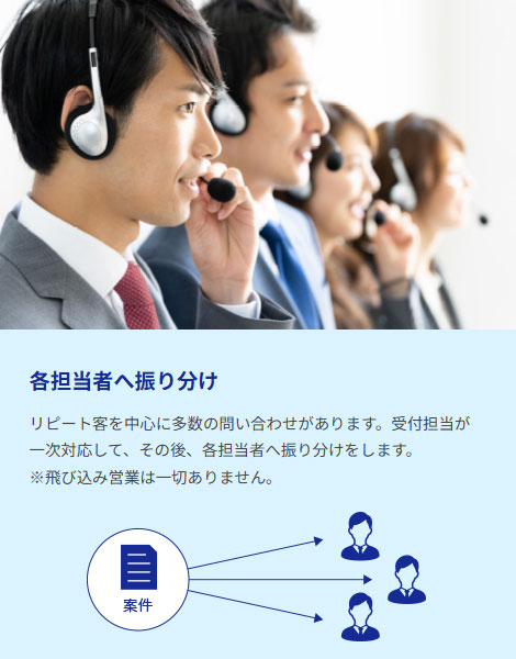 ありません。 弊社では、チラシやインターネットからの反響、リピート客や紹介など、お客様からの反響を各担当者に割りあてるため、飛び込み営業は一切ありません。